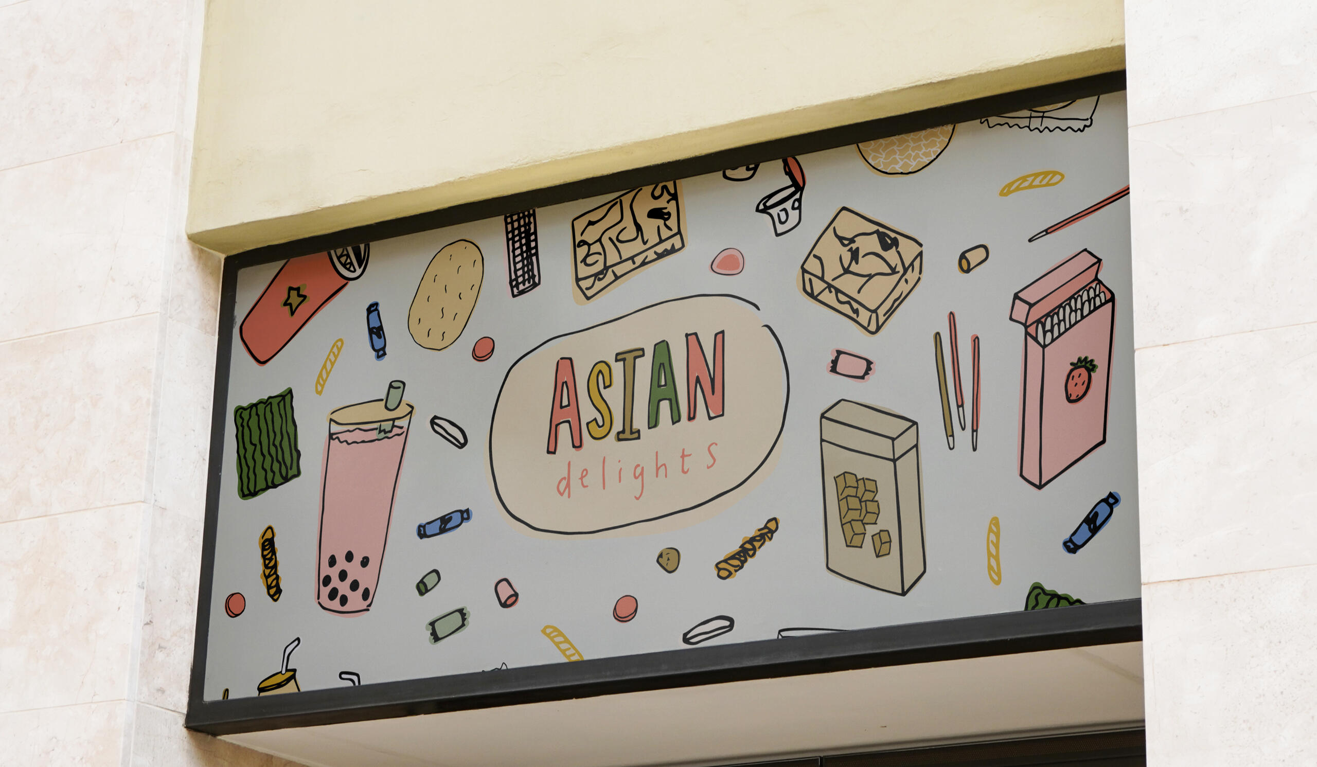 The offset coloring in the illustrations for 'Asian Delights' is to depict nostalgia with a sense of playfulness and sweetness through its colors and style.