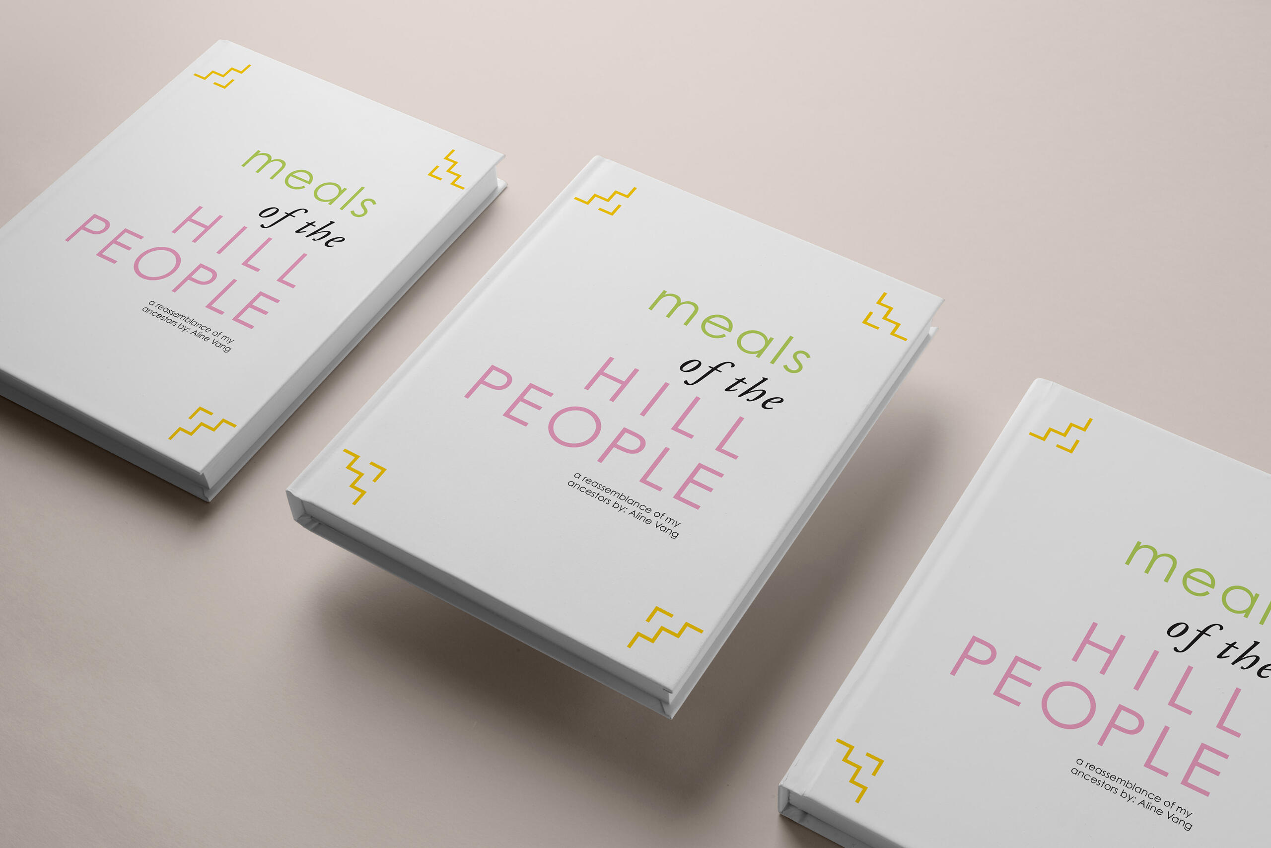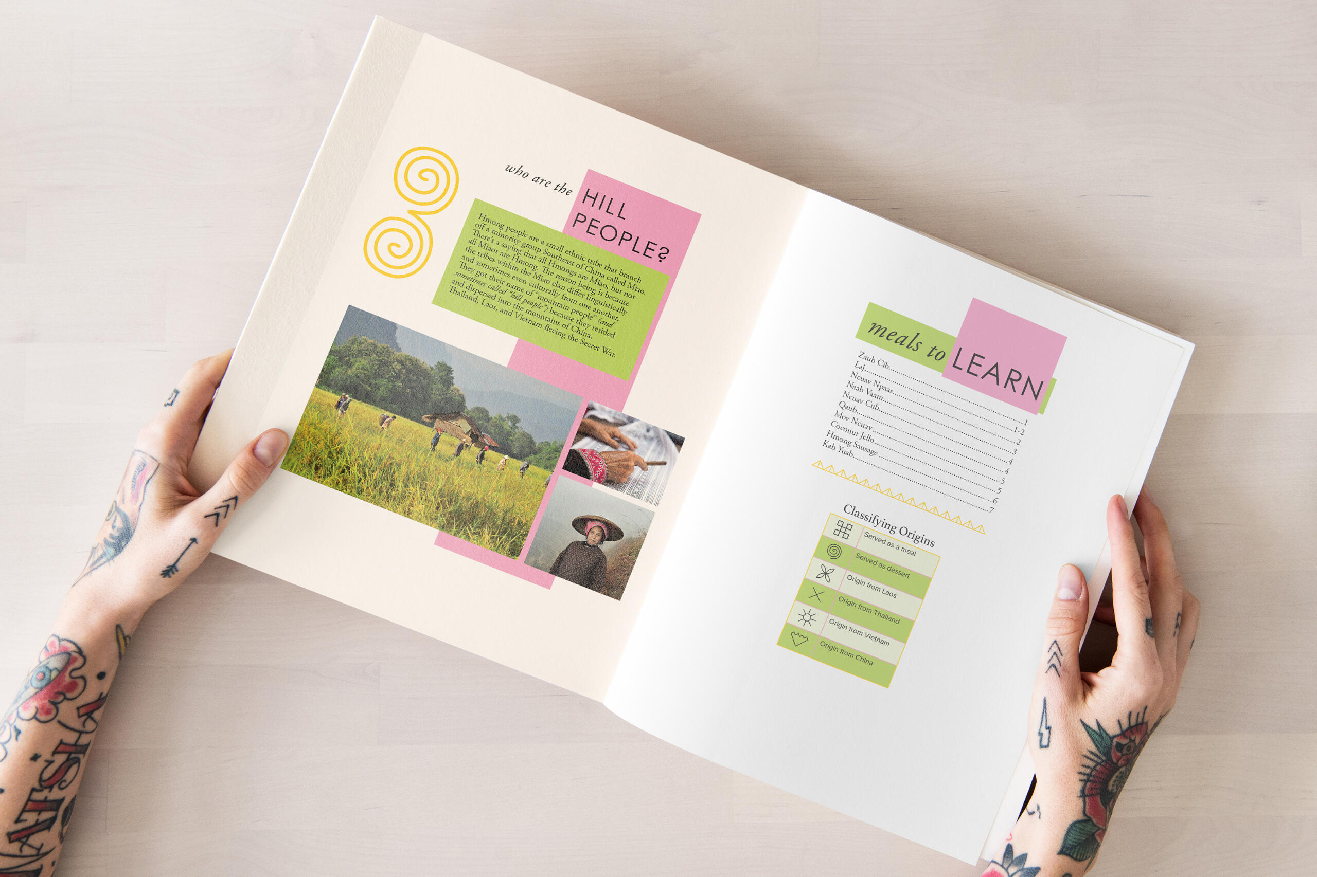 Meals of the Hill People is a recipe book based on foods that are familiar and well known within the Hmong culture. Inspired by Hmong clothing, symbols, and color—the spreads of the recipe book are laid out in a way that identifies the country origin of each recipe.