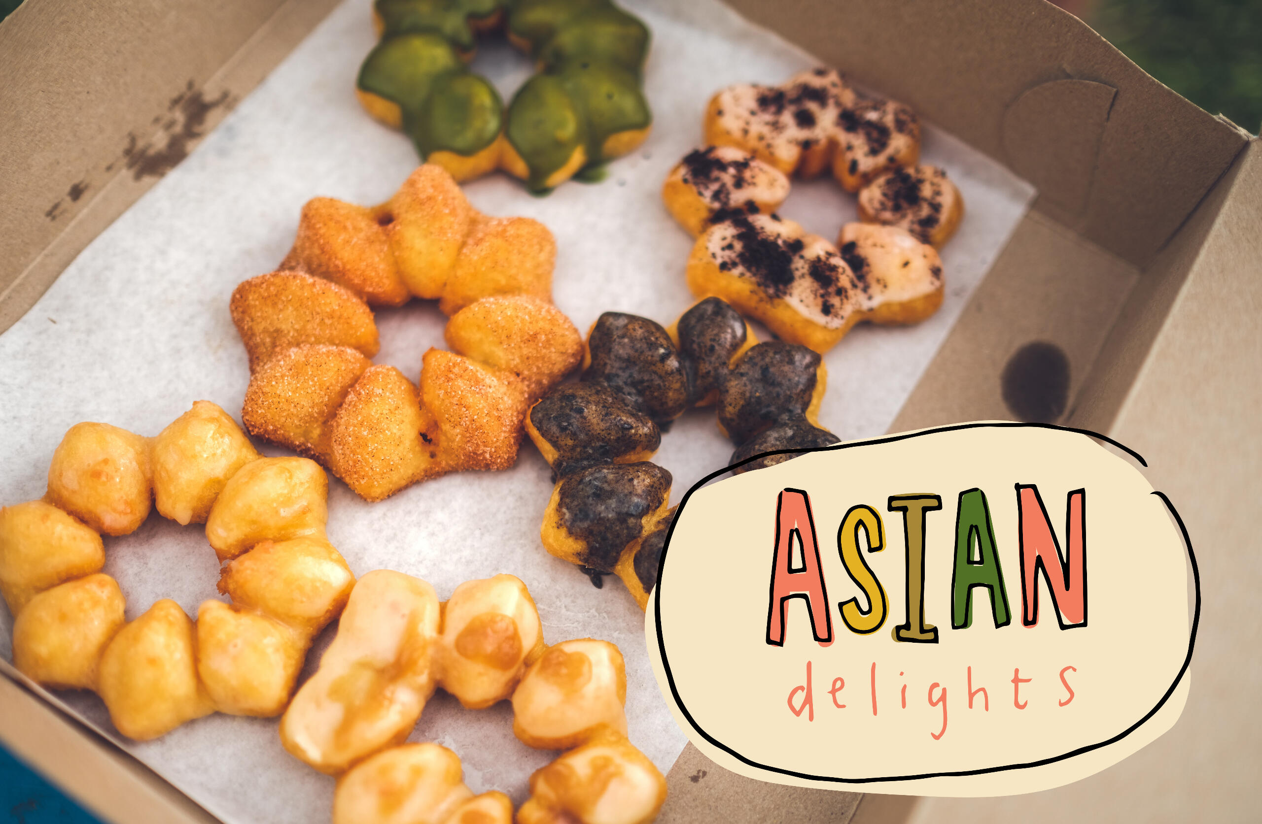 The offset coloring in the illustrations for 'Asian Delights' is to depict nostalgia with a sense of playfulness and sweetness through its colors and style.